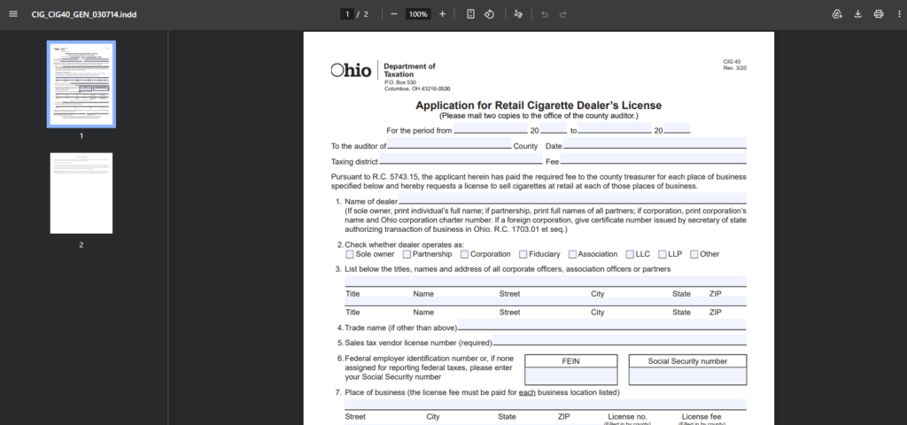Once the vendor license is in place, applicants should fill out the cigarette dealer license application. This form collects business contact details, owners’ information, and the types of tobacco products to be sold.