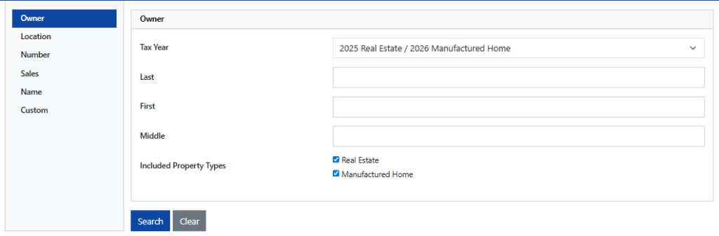 - Choose the search type, typically “Owner Name” for individual or business searches.